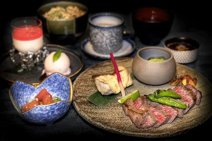 Sides like Mixed Vegetable Stew, a Momotaro Salad and a Sakura Panna Cotta made in-house with sakura jelly and flowers, and served with peach ice cream, complete the experience.