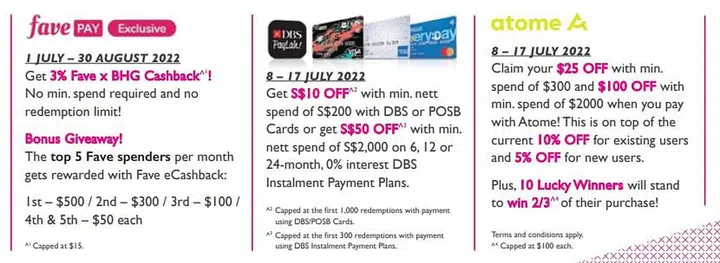 Want an extra sweet deal? Enjoy payment promotions from Favepay, Atome, and DBS and POSB cards when you spend at BHG.