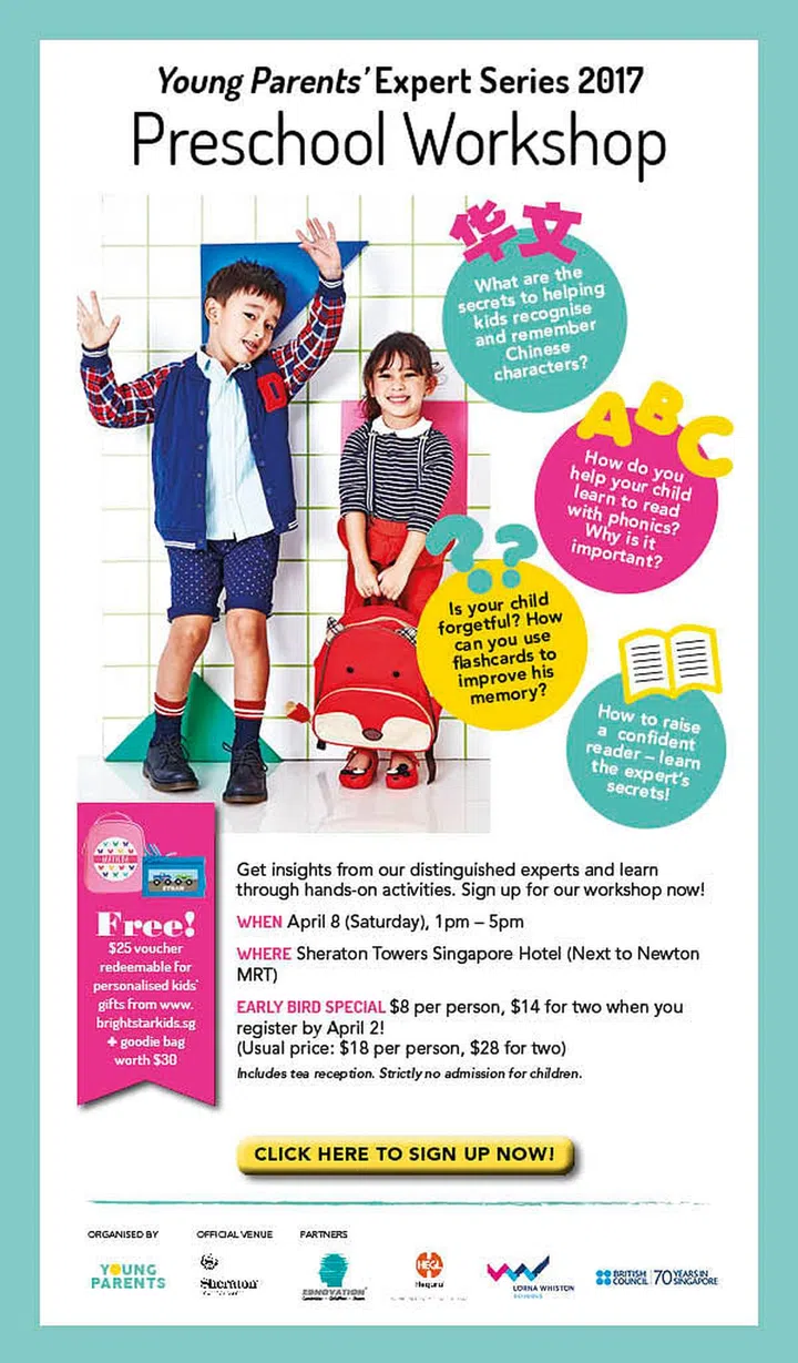Give your child an educational boost at Young Parents’ Preschool Workshop through hands on activities and insights from distinguished experts. The different workshops will focus on reading strategies, memory improvement and learning Chinese effectively. Also, get a free $25 redeemable voucher from brightstarkids.sg and a goodie bag worth $30 when you sign up.