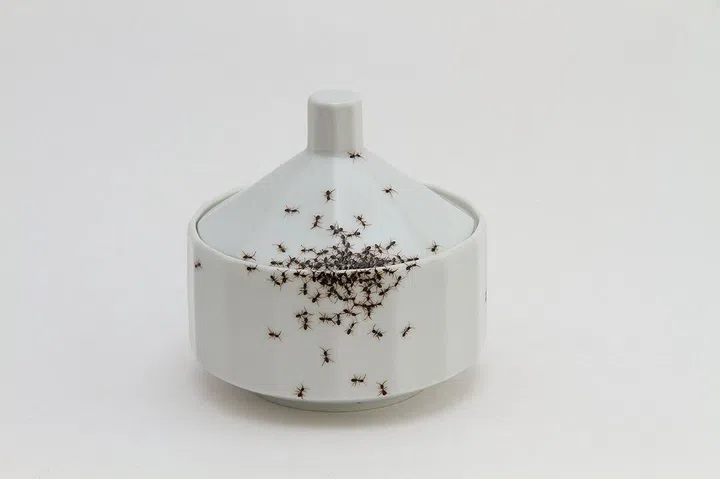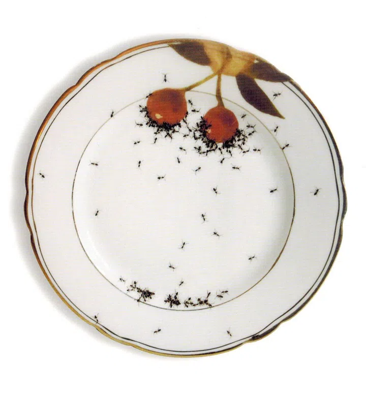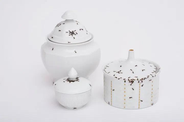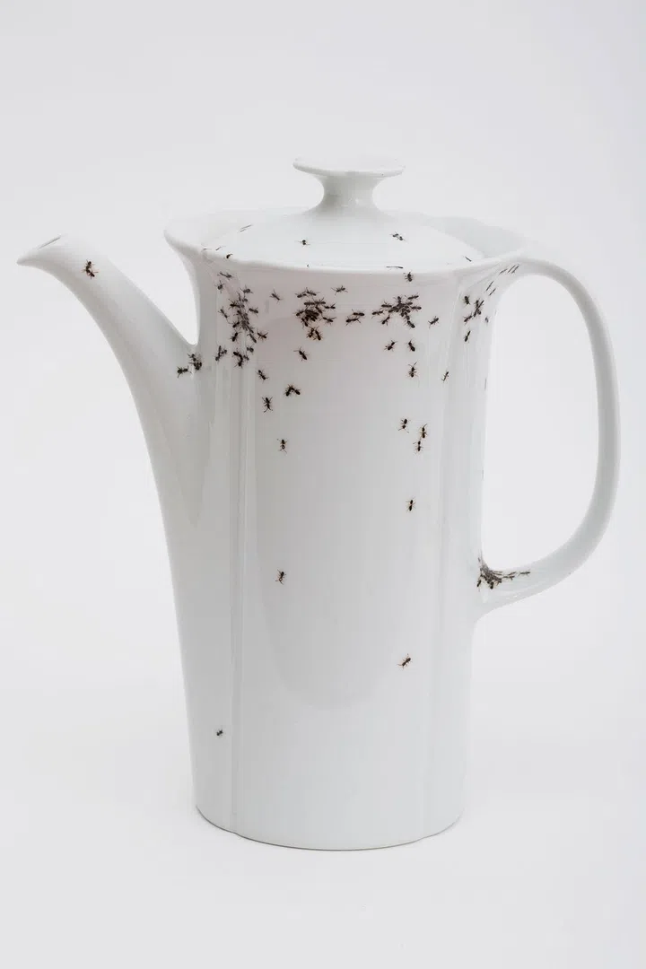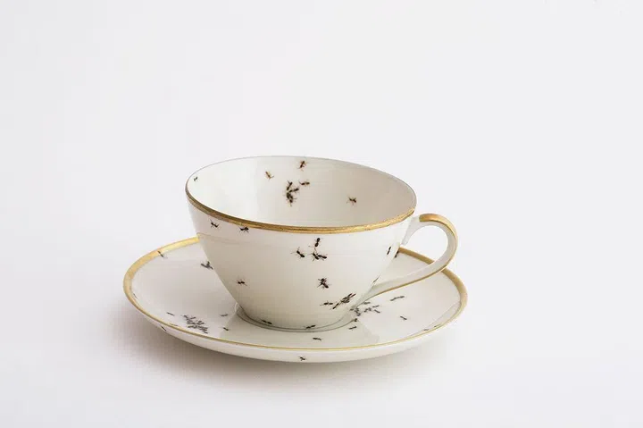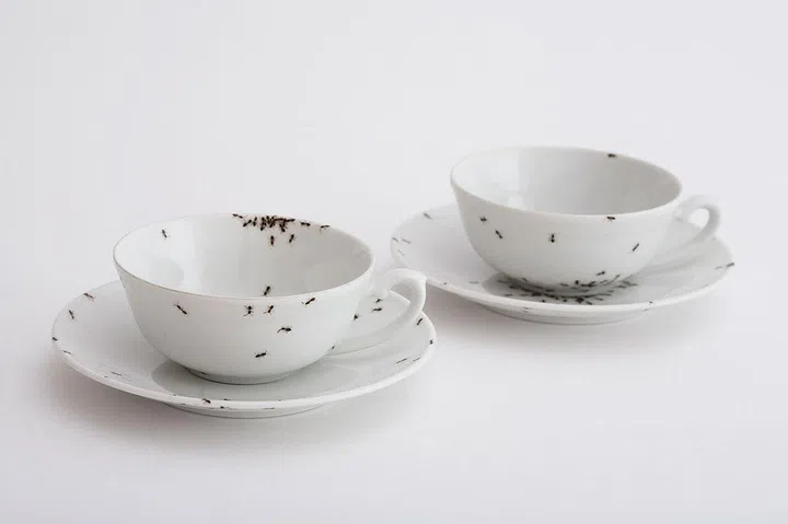After accidentally leaving her dirty plate on the table overnight, German artist Evelyn Bracklow (La Philie) was inspired to create a collection of old-style porcelain crockery accented with ants painted crawling over them.
