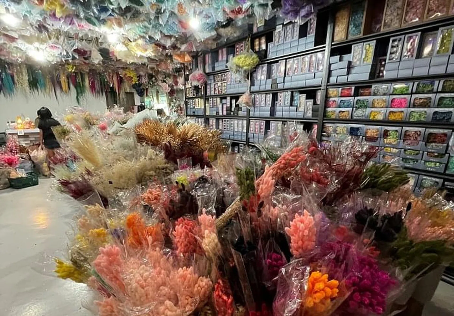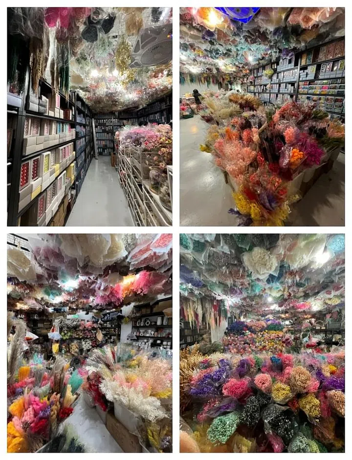 Upon entering, you are immediately transported into a literal wonderland of floral offerings. Every inch of the walls and even ceiling is filled with a dizzying array of preserved and dried flowers. These range from the common baby's breath, to huge heads of hyancinths and stalks of pampas grass.