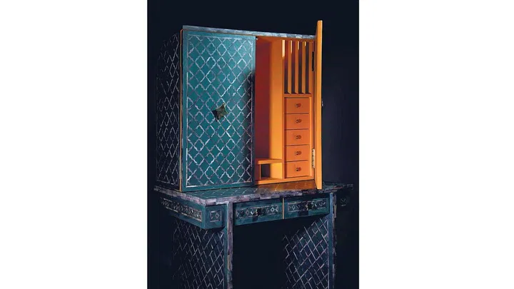 The last collection is Diantara, which comprises a cabinet, a sideboard and a desk. Diantara in Malay means in-between, and Mr Paul, principal at Aretese, was inspired by the lines in-between Peranakan tiles. The pieces are not quite what they seem. For example, the desk has concealed compartments and the cabinet opens to reveal customisable storage compartments, as well as a 360-degree cocktail swivel shelf. Prices start from S$2,250.