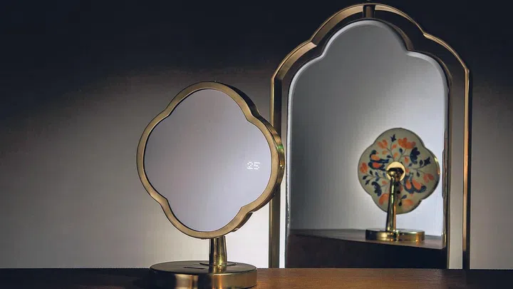 Straits Reflection comprises a desk vanity mirror and a floor-length mirror. The brass mirrors' four-leaf clover design were inspired by Peranakan tiles, according to Mr Sun, an industrial designer and director at Orcadesign Consultants.