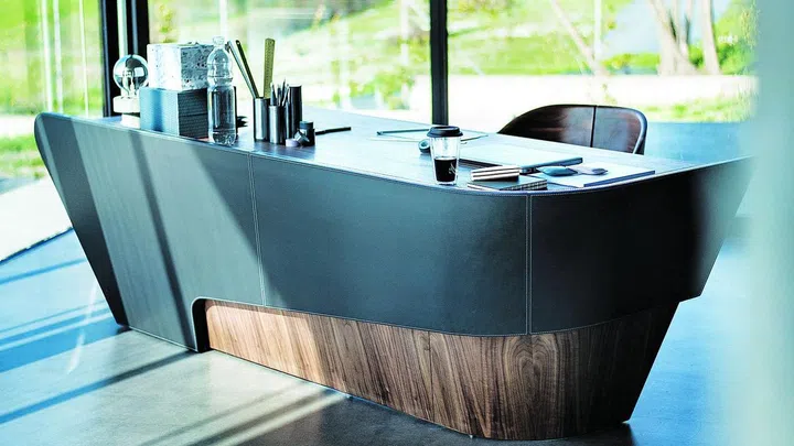 The Klip desk, by Karim Rashid, is characterised by smooth flowing lines, a top made from solid wood and drawer fronts covered with leather.