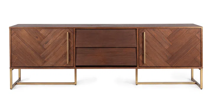 Rustic finished acacia in a classic herringbone pattern, paired with brass legs and handles, this piece is set to add a warm look into your living room.