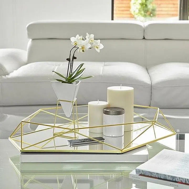 Accessorise with brass-accented pieces too, such as this mirror which also doubles as a tray if you like! The geometric design makes it look very artsy too!