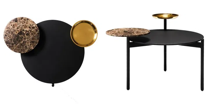 With 3 surfaces positioned at different heights and clad in various finishes including black linoleum, brown marble and brass, this coffee/side table serves form and function!