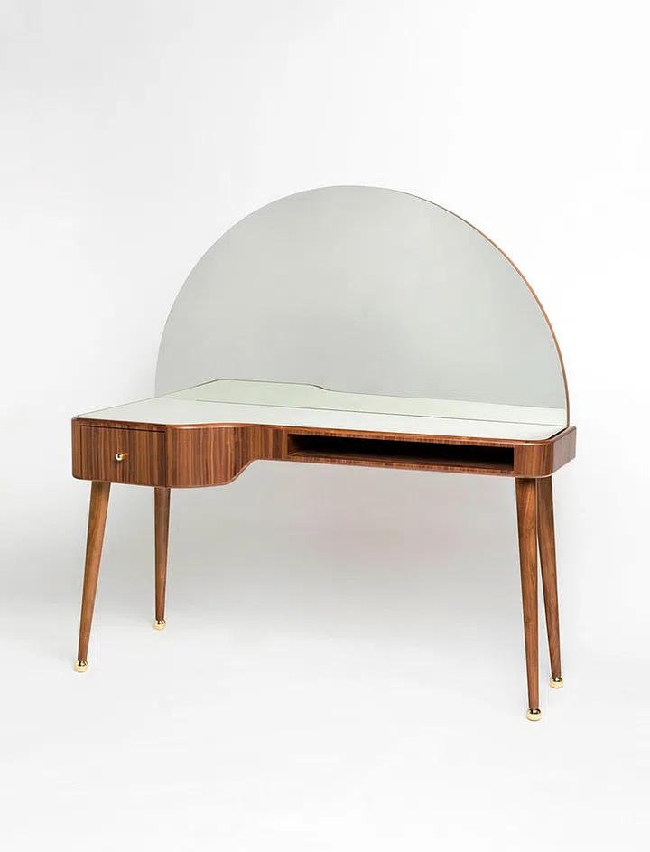 We like the half-moon shape of this American walnut vanity – untypical and super elegant.