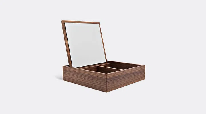 Keep your skincare and makeup neatly out of sight in this oiled solid walnut beauty box, which features a leather strap and mirror inside the lid.