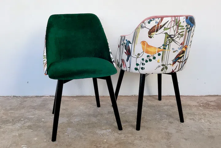 Luke chair and Luke chair with arms, in Christian Lacroix Birds Sinfonia Perce Neige (back) and Aqua Clean Bellagio (front), $590 and $650 respectively, from Blafink.