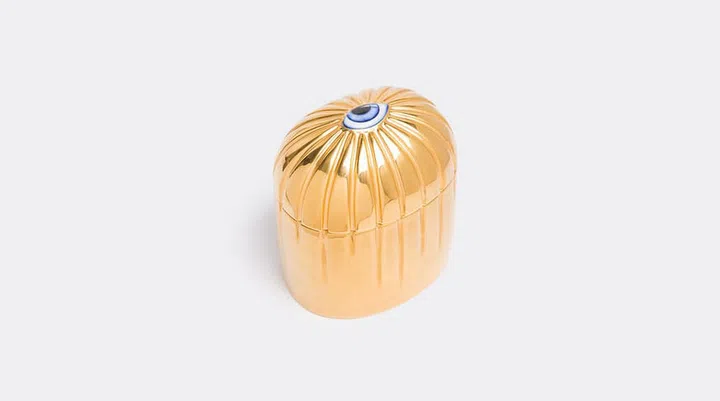 We like to save the finest luxury for the most intimate spaces. This handcrafted paraffin wax candle is presented in a 24-karat gold plated porcelain holder, which is inlaid with a resin blue eye.