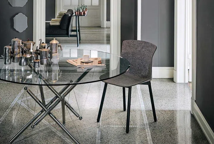 Designed by Theodore Waddell, this dining table features a unique polished chromium-plated steel base that has a beautiful futuristic edge.