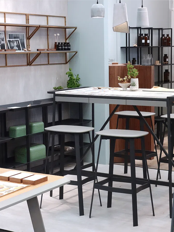 Create additional seating and gathering spaces in the home with Mondi Lifestyle Gallery and JotterGoods’ (#03-25) Camper high table, which comes with a Volakas foil-coated marble top, hellgrau stained ash wood and a black powder-coated steel frame.