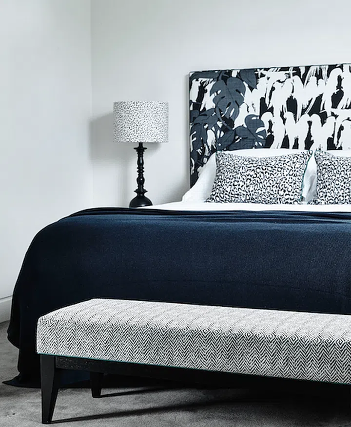 Curica Charcoal fabric on headboard by Michael Szell for Christopher Farr Cloth, from Tatum.