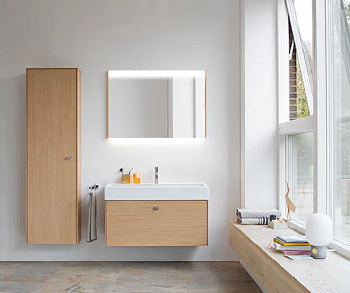 range of bathroom furniture has an understated aesthetic with its seamless shapes and muted finishes. We especially like the look of the matching cabinets and mirror, the latter with a 60mm-wide, 300 lux-strong LED edging light at