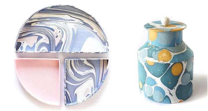 Brighten up your home with pops of colour from Living DNA’s latest collections of marbled paper accessories, from hexagonal trays and canisters, to jars and boxes. Made in Jaipur, India, the pieces are all made of recycled cotton textile scraps.