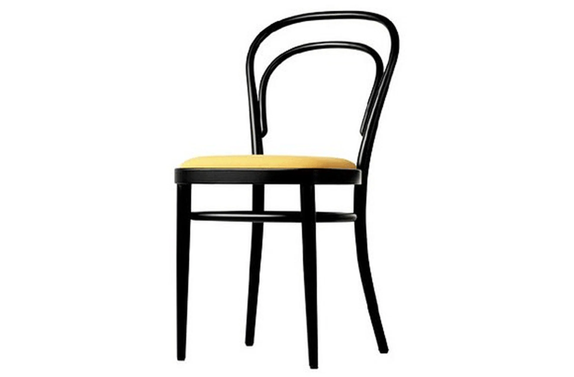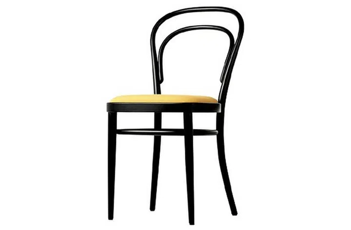The 214P is one of many offshoots of the original No. 14 chair. This edition comes with a cushioned seat, while its predecessor sported woven cane or palm seats that had gaps to allow split liquid to drain off quickly. Modern variations include pieces with straight or tapered legs, or with moulded plywood seats that come bare or covered with leather or fabric.