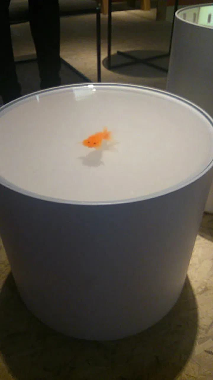 Up in the air table by ViccarbeGoldfish live forever in this table by Ramon Ubeda and Otto Canalda for Viccarbe. Sculpted by a professional sculptor who used to be a fisherman, the fishes "swim" in a crystal clear pool of "water" of which the material is a trade secret. Watch the video on the making-of: