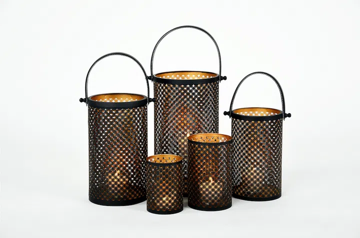 The lanterns (pictured) are made of powder-coated iron, and are great even for outdoor use.