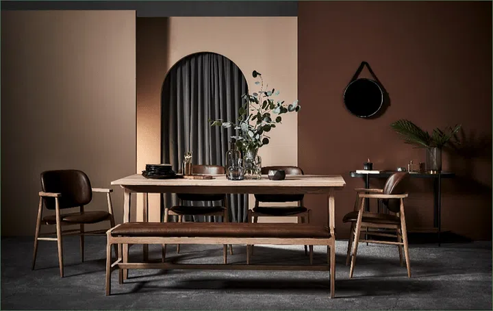 (Photo from Habitat; The Dualtone dining table is made up of bright oak and dark walnut set in mid-century flavours. Its simple two-toned design and light colours allow for the easy matching of an eclectic mix of colours and patterns.)