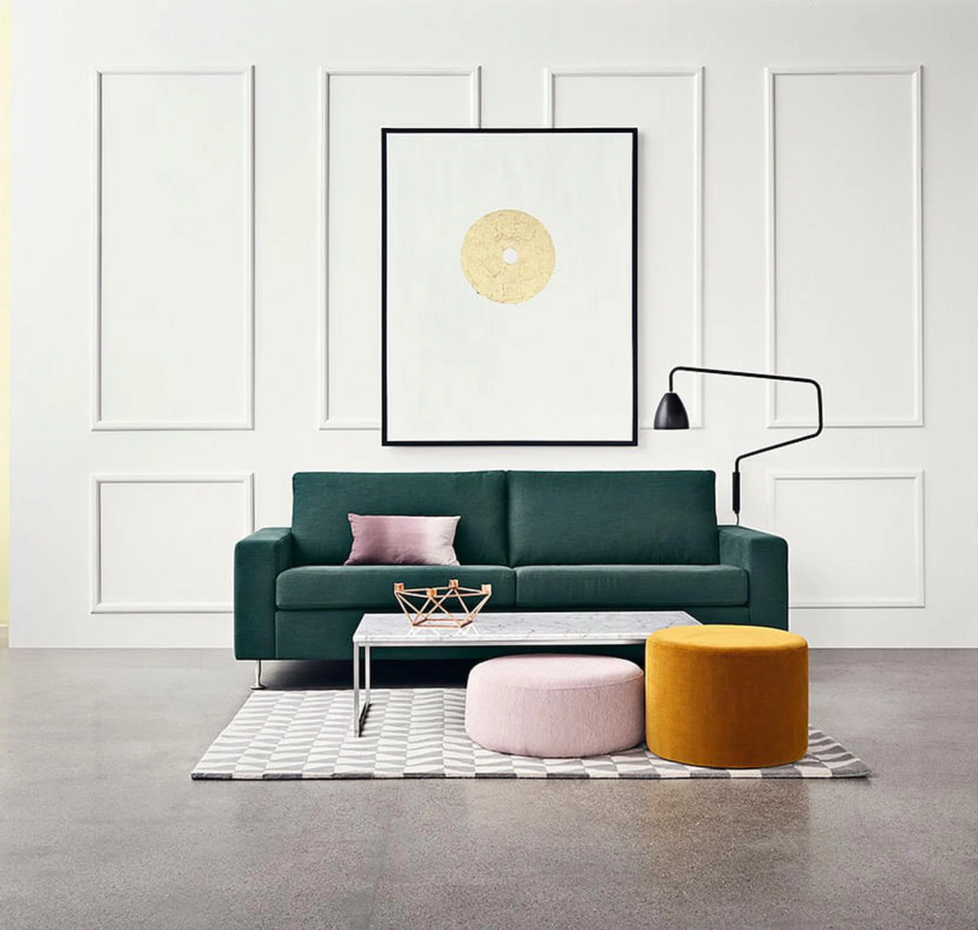 Milano sofa, Como coffee table, Stretch Arm wall lamp, Zyl footstool & MP rug