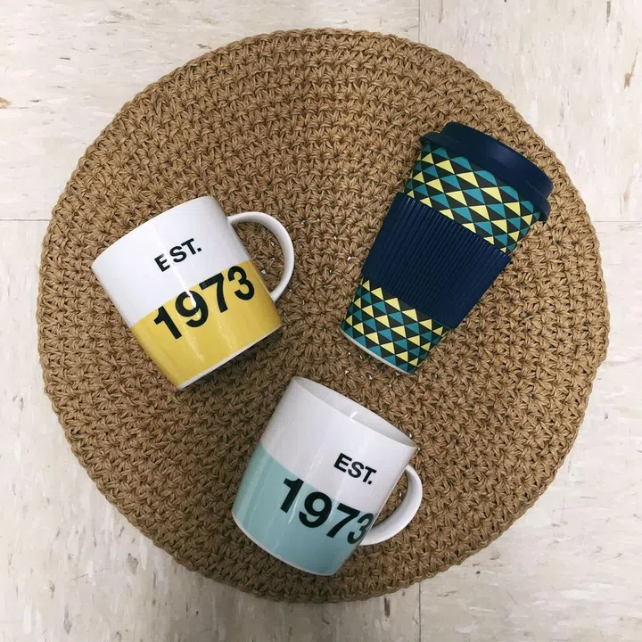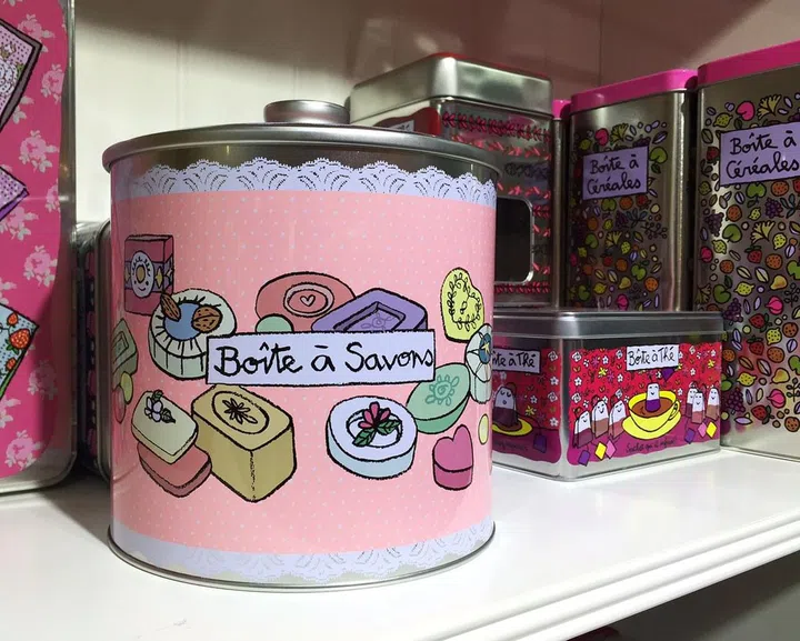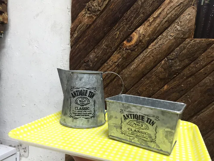 Bright yellow checkered serving tray, and mini "antique" tins in various styles
