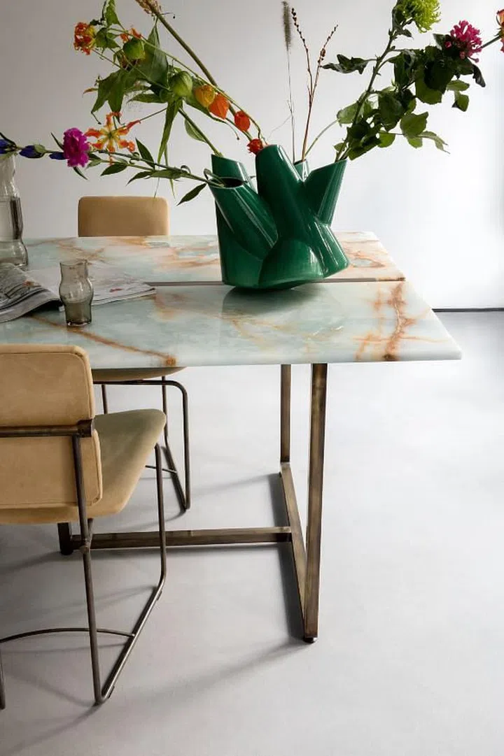The Netherlands-based furniture brand Ghyczy, founded by established designer Peter Ghyczy, has launched 16 new designs from tables and chairs to shelving and desks in its 2018 collection. This range gives special attention to materials, and even explores the tactility of new materials such as onyx and aged brass. With a table top in onyx and an aged brass frame, the Pivot T3456 dining table sees the two materials elegantly paired. The table was designed in collaboration with Amsterdam-based Collective Studio.
