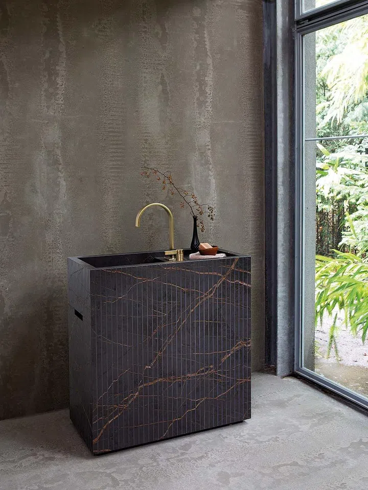 Cosentino has collaborated with Dutch designer Remy Meijers to create freestanding sculptural sink Dekton Scondido. Inspired by the idea of water that springs forth from a block of stone, Scondido features a brushed brass spout from Dornbracht and two hidden side drawers.