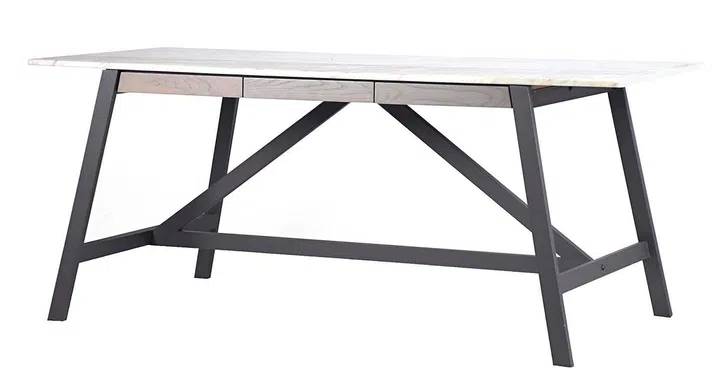 Consider the Task dining table from Jottergoods in volakas foil-coated marble top and white ash wood in Hellgrau stain.