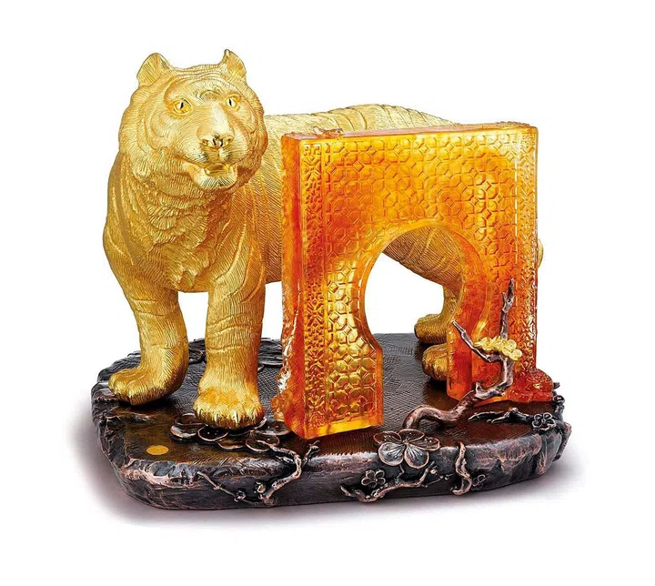 A magnificent tiger stands just behind an amber Liu Li moon gate, which invites fortune and happiness to pass through, while a delicate plum blossom represents the five blessings of longevity, prosperity, health, virtue, and harmony.