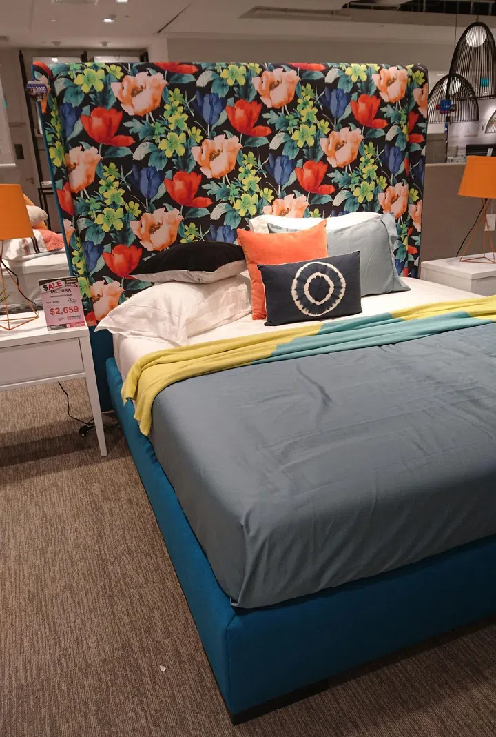 Another interesting fabric bedframe you don't see very often, this one has a pattern of bright flowers, which reminds me of a wallpaper print. Mildura King-size bedframe on sale now at $2,659.