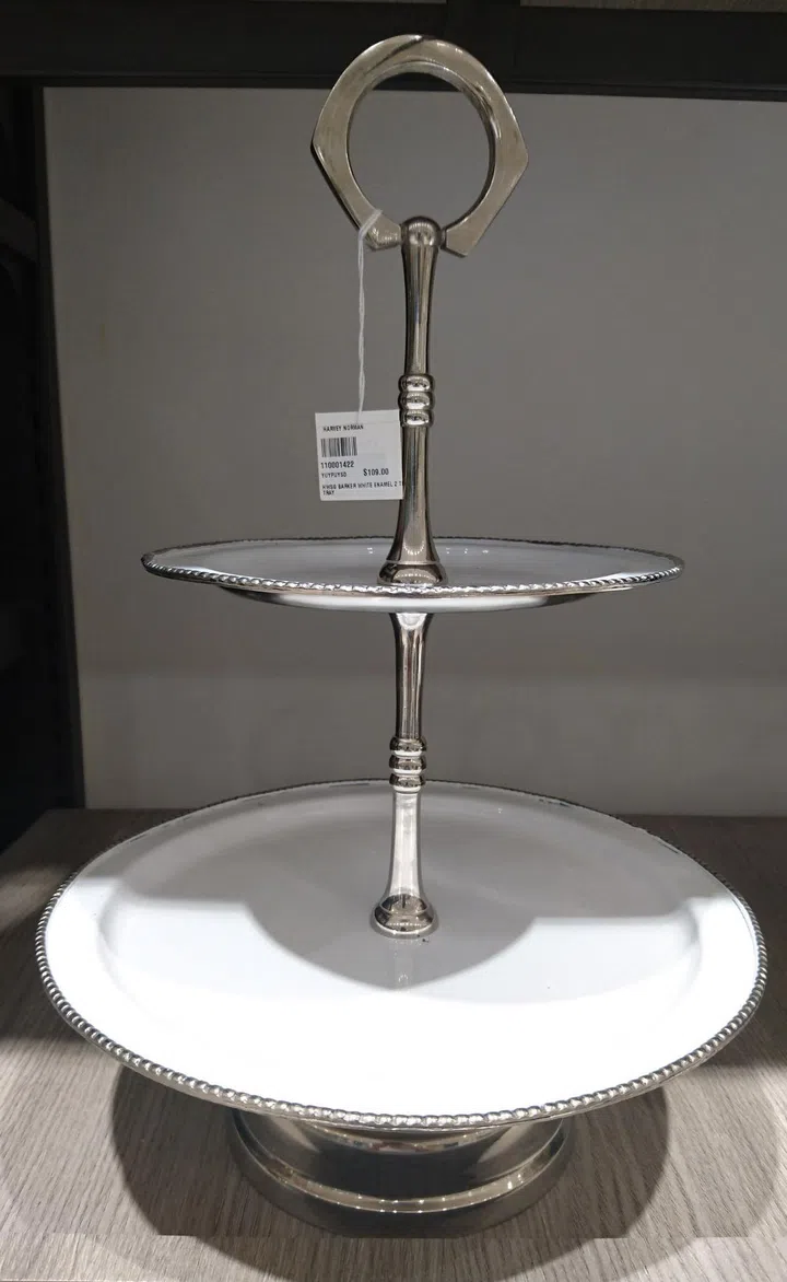 Unusually, this multi-tier tray is made of white enamel, giving it a vintage look. It's priced at $109.
