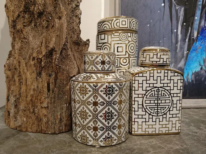 Modern-chinoserie style white and gold vases – I feel they look better in multiples and grouped like this! Prices unavailable.