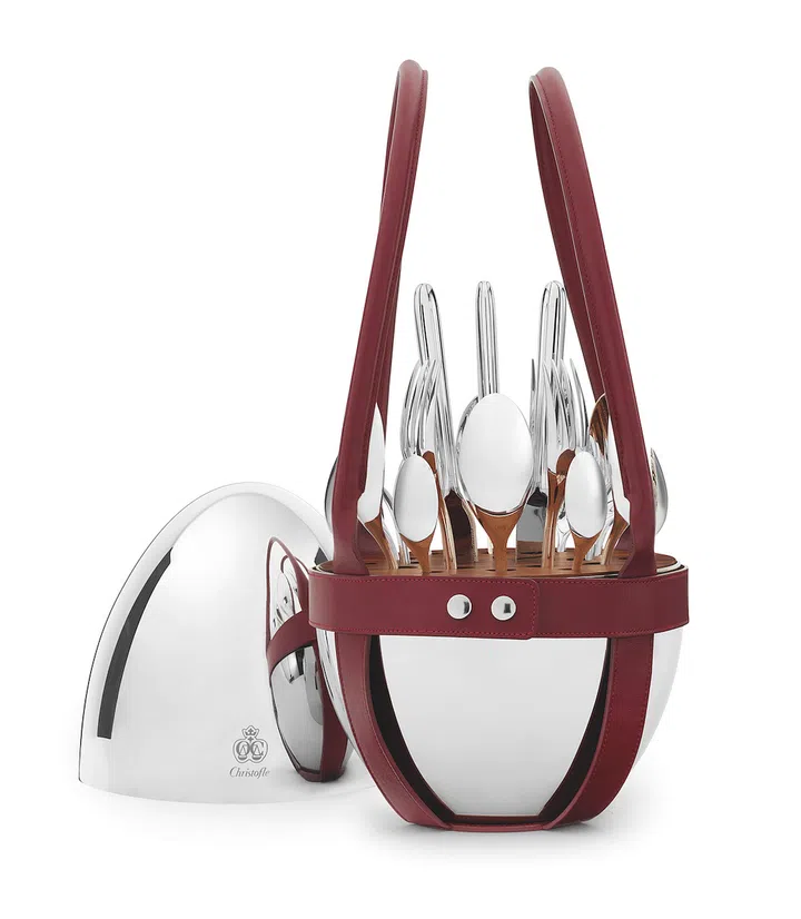 There is a charming insouciance to outdoor dining, but Parisian luxury silverware brand Christofle thinks a little elegance can elevate the experience to sublime heights with their Mood Nomade. A mirrored steel carrier in a sleek ovoid form with full-grain calf leather handles in cherry red, it bears a complete silverware service for six.