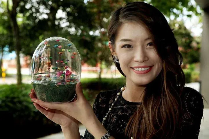 A pot of seven to eight flowers costs $6.90, while a glass container with about 50 to 60 flowers is $59.90. The flowers do not need soil and have stalks which are stuck into sponges for stability. Some are decorated with animal figurines.