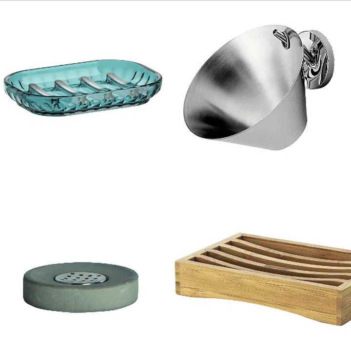 Clockwise: Svartsjon soap dish, $3.90, from Ikea; Axor Starck soap dish, $492.80, from Hansgrohe; Dragan bamboo soap dish, $6.90, House Doctor cement soap dish, $29, from Naiise.