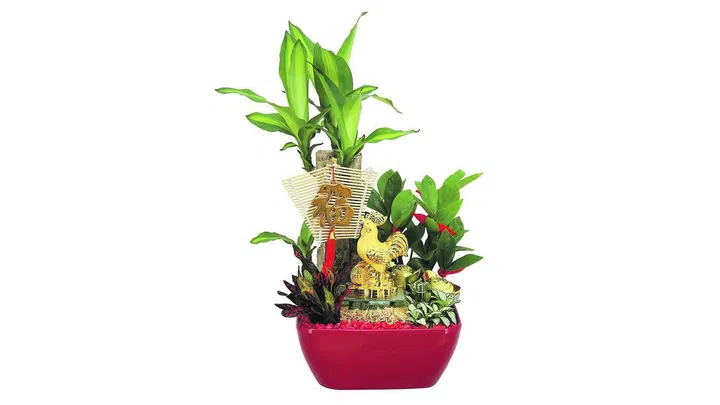 Usher in prosperity and good fortune with this table garden that comes potted with various festive plants with auspicious connotations, a golden rooster figurine and gold ingots. The plants are indoor-friendly too.