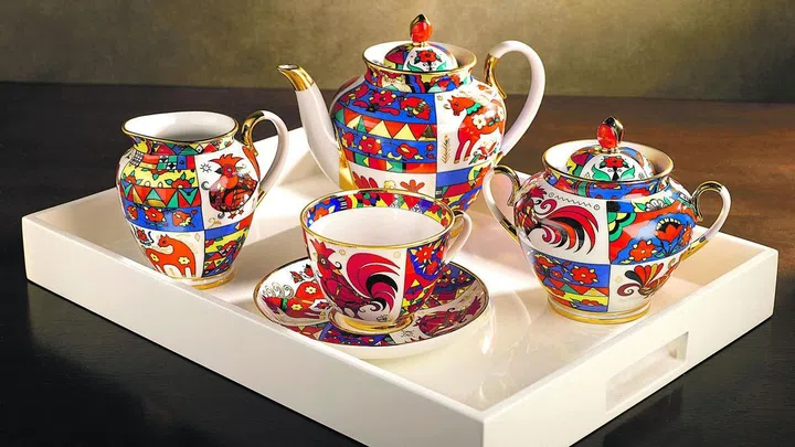 Inspired by an ancestral design, this set comprising teapot, creamer, sugar bowl, teacup and saucer is carefully hand crafted in the oldest and most renowned Russian porcelain manufacture. It also features exquisite 22carat gold leaf detailing.