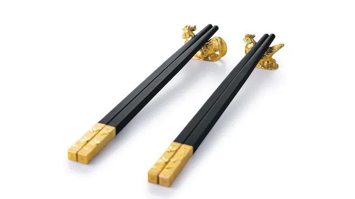 Having the reunion dinner at home? Set the table with this pair of gold-capped chopsticks. A set comes with two pairs of chopsticks and rooster and hen chopstick rests.