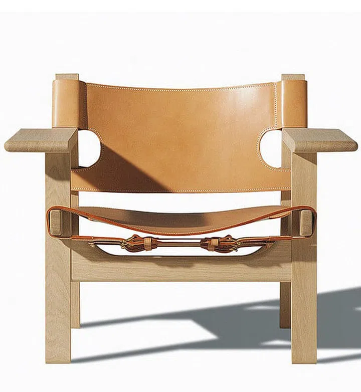 In the Spanish Chair, you will see inspiration from two design cultures: the simplicity and clean lines of the Danish, and elements of traditional chairs, such as broad, flat armrests and low height, from areas in Spain influenced by ancient Islamic culture. The natural materials such as solid oak and soft leather give it a masculine appearance, and the chair's innovation can be seen in designer Borge Mogensen's leather seat. The straps of the back can be tightened as the leather expands, so the chair will always give you a secure and comfortable perch.
