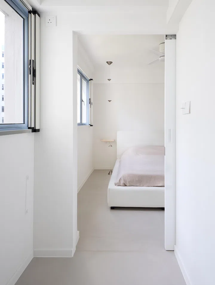 By pairing white-on-white, Rong has cleverly manipulated her 947 sq ft apartment, where every room appears larger than it is.