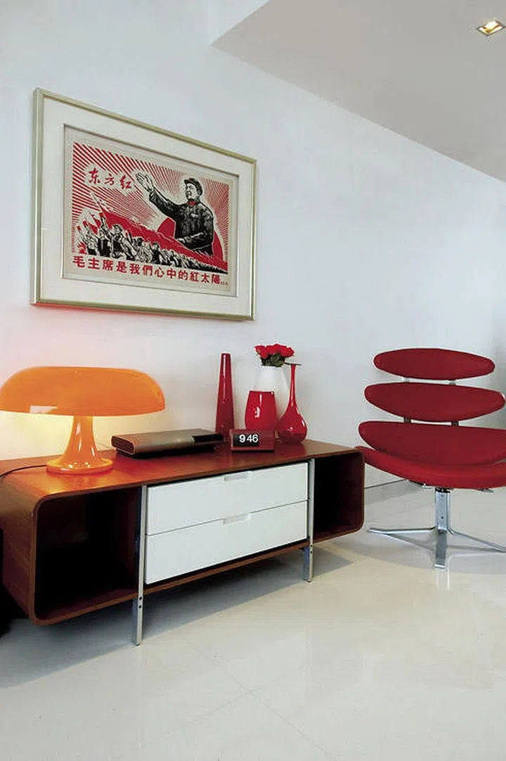 4. The trick to get a polished look with a daring colour scheme is to remain disciplined. Here, the homeowner restrained the use of reds to more sizeable objects like the striking wall art and glossy dining table to create a more arresting impression. (Interior design by DistinctIdentity)