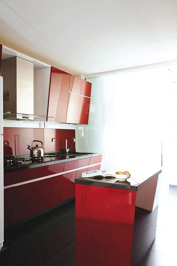 5. Match bold red kitchen cabinets with slanted fronts for an edgier style. (Interior design by Space Vision Design)