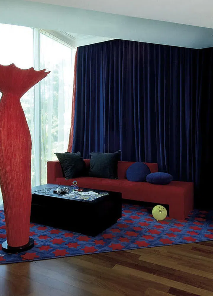 10. Crimson and midnight blue, coupled with lush velvet textures, come together to create a lush, moody boutique feel here. (Interior design by Iwan Sastrawiguna Interior Design)