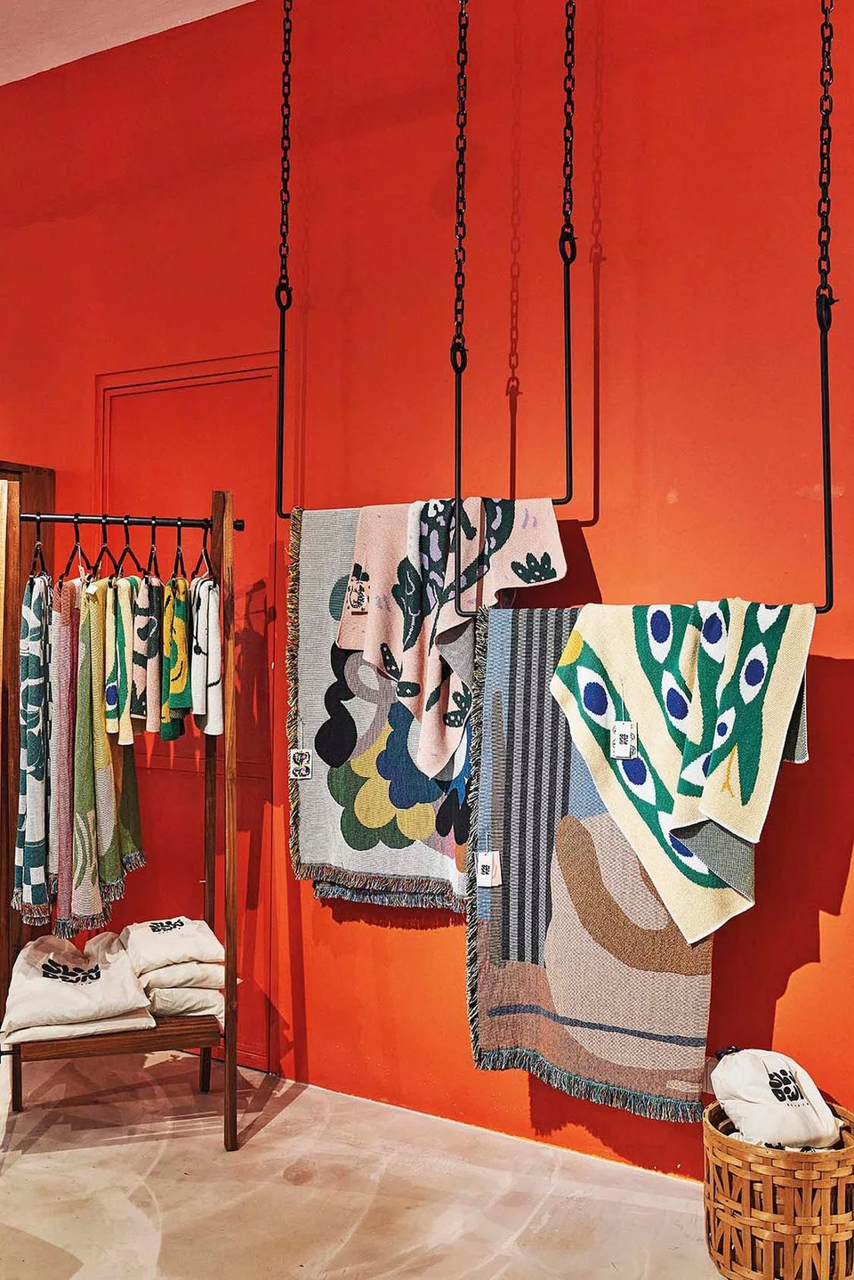 Quirky throw from Slowdown Studio contrasted against the orange wall.
