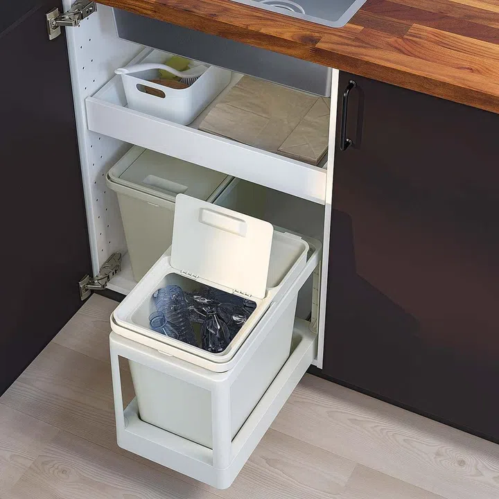 For a more sustainable lifestyle, integrate the IKEA HÅLLBAR waste sorting bins (from $12.90) near your sink, where you can separate food waste from recyclable items.