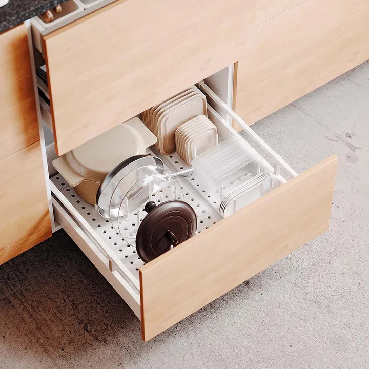 Back-up consumable products, large occasional items like baking equipment items, and party ware can be stored in a bottom drawer, which is functional as a stepping storage box by Song Cho for you to reach for items at a higher level.