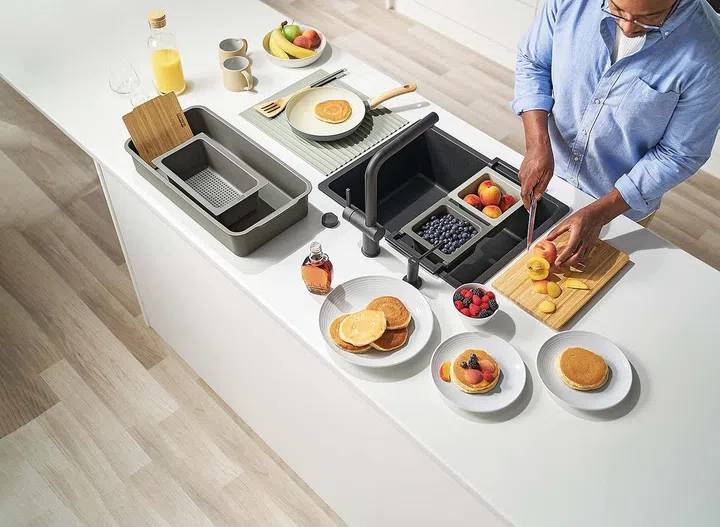 Wash food items effortlessly with strainer bowls that go over your sink, freeing up the kitchen countertop space. A silicone pad is a must-have to place any wet dishes temporarily while prepping your food on the bamboo chopping board. Keep all the sink accessories efficiently in an all-in ($549) set by Franke.