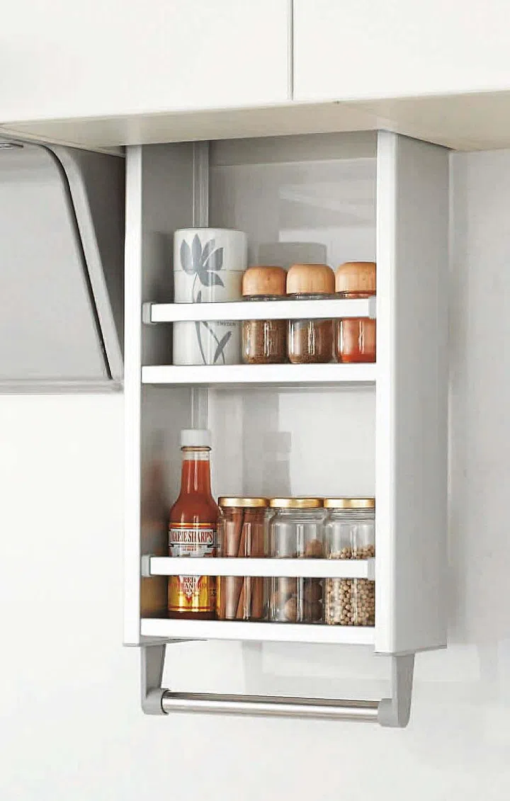 An alternative to having a slim spice rack drawer is this pull-down spice rack by Song Cho that can be tucked right next to your kitchen hood. Have all of your seasonings and condiments right at your eye level when you are in the middle of cooking.