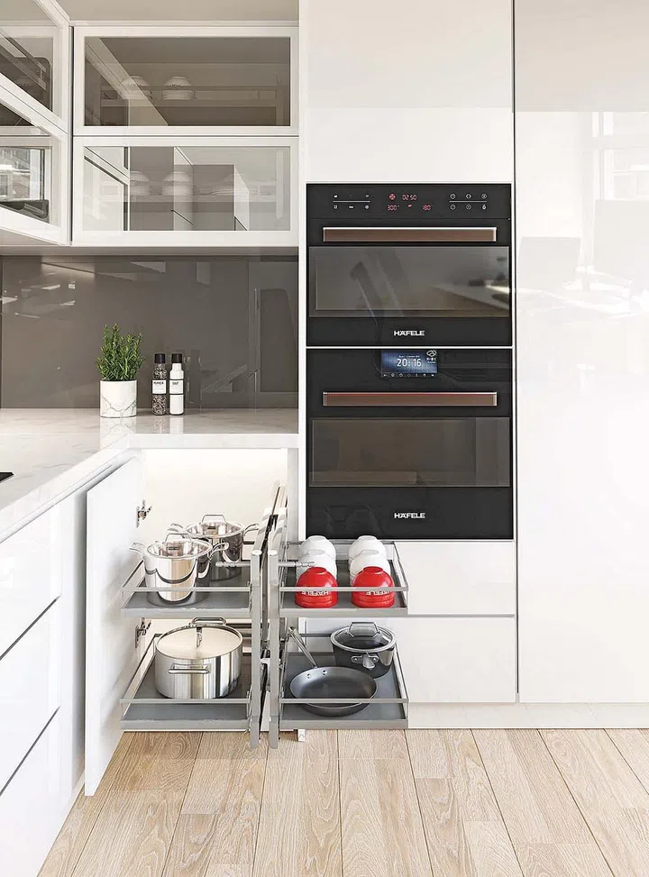 Store large and mismatched pots and pans in drawers that come with heavy-duty drawer tracks, or make use of a smart corner cabinet pull-out system by Hafele.